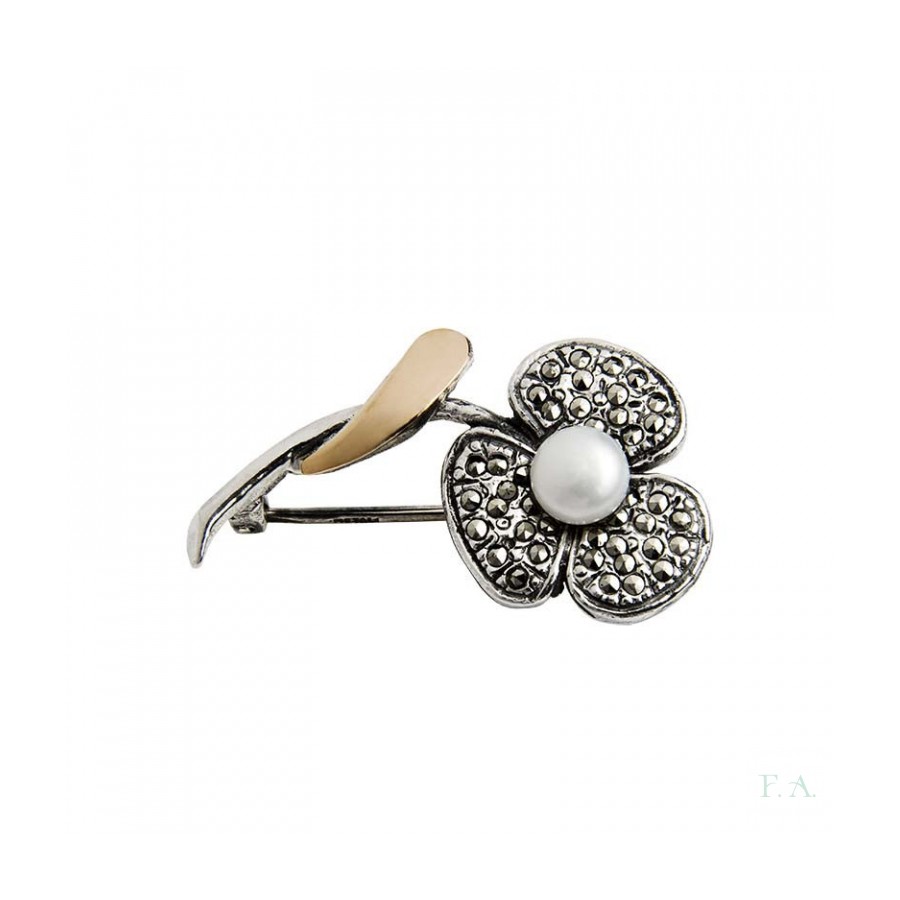 Alfinete Flor PRATA E OURO 9K C/ MARCACITES