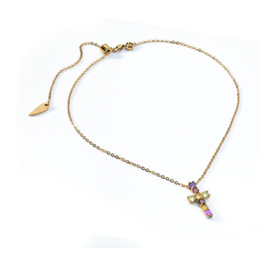 Colar Lost In You de aço hipoalergénico. Peça em formato de cruz com pedras multicolor. Esta cruz carrega toda a esperança depositada num mundo melhor, de maior paz e, combina a garra de viver no coração de todas as mulheres.
