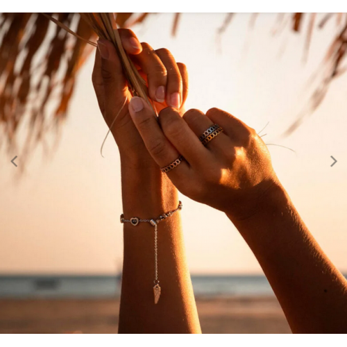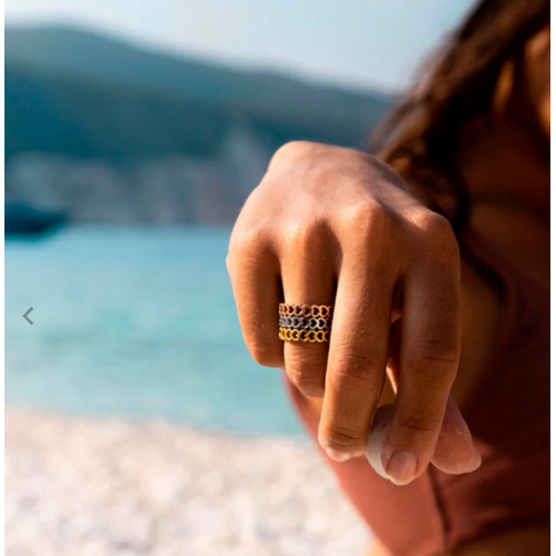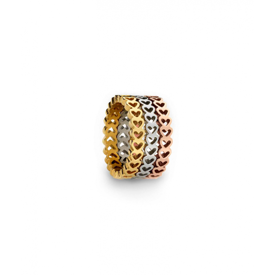 Anel Secret of Love tricolor em aço hipoalergénico, com malha em formato de coração. Estão representadas os três pilares importantes na vida de uma mulher, a paixão, a felicidade e a amizade nas três cores predominantes desta coleção: rose gold, dourado e prateado. .