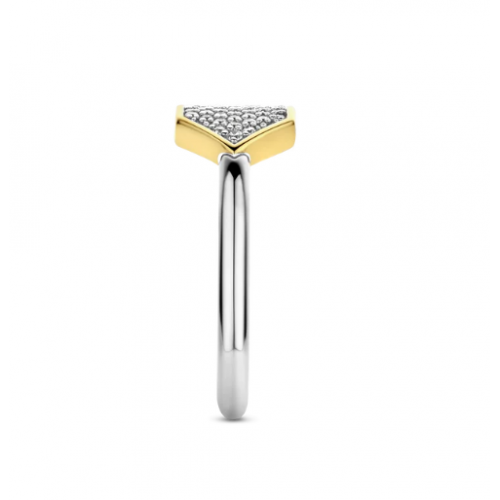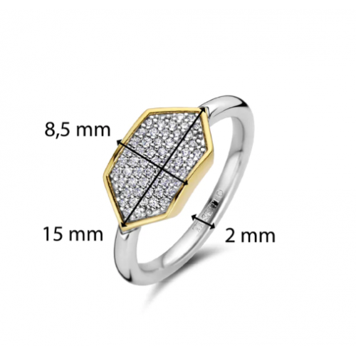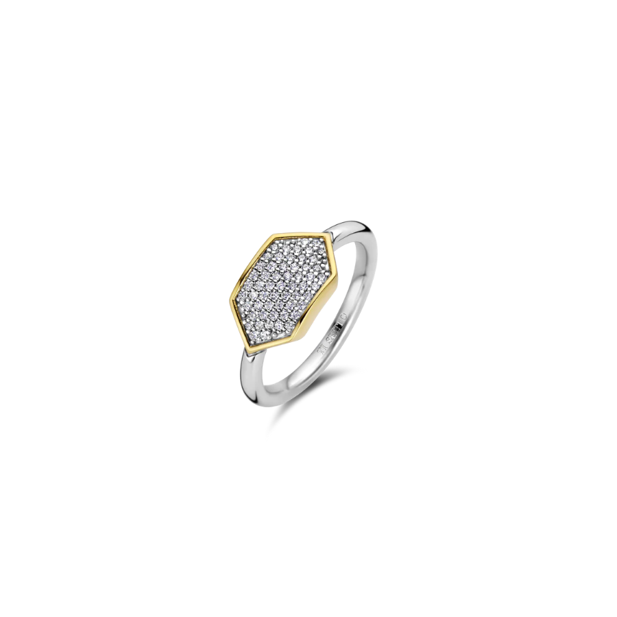 Este anel de prata TI SENTO 12310ZY exibe um cenário de pavê hipnotizante de pedras cúbicas de zircônia dispostas em uma forma geométrica cativante, reforçada por um cenário radiante banhado a ouro. O brilho das pedras cúbicas de zircônia é elevado pelo luxuoso cenário banhado a ouro amarelo que exala opulência e sofisticação. Este anel opulento é fabricado com prata de lei 925 da mais alta qualidade. Este anel adicionará uma borda vintage a roupas aparentemente clássicas. Faça uma declaração com este sofisticado atrativo. Todos os nossos anéis são livres de níquel e hipoalergênicos.